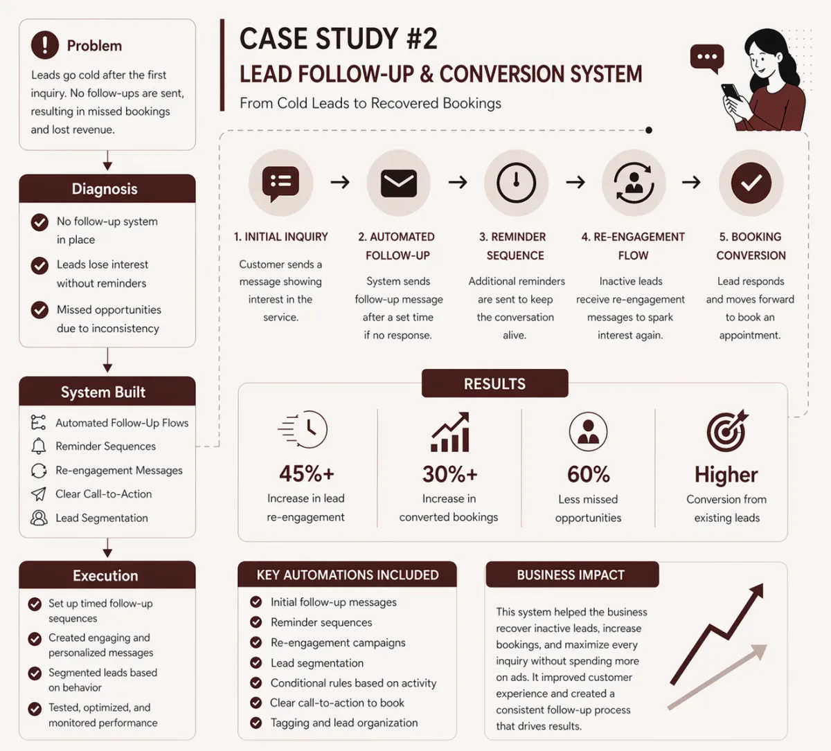 A structured follow-up system was created, including automated messages, reminder sequences, and re-engagement flows to bring inactive leads back.